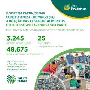 O alimento chegou à mesa de 3.245 mil famílias rurais do Rio Grande do Norte por meio da Federação da Agricultura, Pecuária e Pesca do Rio Grande do Norte (FAERN) e do Serviço Nacional de Aprendizagem Rural do RN (SENAR/RN) que aderiram ao Agro Fraterno, movimento liderado pelo Sistema CNA/Senar, pela Organização das Cooperativas Brasileiras (OCB) e pelas entidades do Instituto Pensar Agro (IPA) que se reuniram em uma corrente solidária para ajudar as famílias em vulnerabilidade alimentar atingidas pela grave crise gerada pela pandemia da Covid.