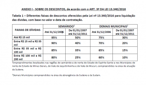 Sobre os descontos vigentes na Lei 13.340/2016, de acordo com art. 3º, eles estão dispostos no Anexo I: