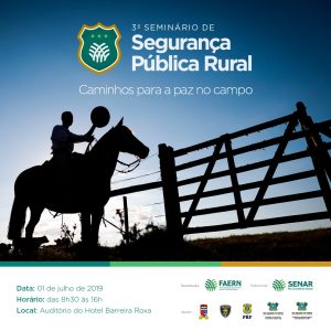 A Federação da Agricultura, Pecuária e Pesca do Rio Grande do Norte (Faern) realiza, nesta segunda-feira (01/07), o 3º Seminário sobre Segurança Pública Rural, onde entidades do setor rural do estado, produtores rurais, agentes da segurança pública do estado se reunirão para discutir a situação de insegurança no interior do Rio Grande do Norte. O evento será realizado no Hotel Escola Barreira Roxa, das 08h30 às 12h45 e das 14h às 16h.