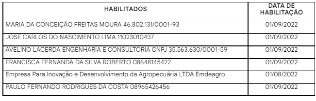 O Serviço Nacional De Aprendizagem Rural, SENAR/RN, tornar público a lista de habilitados no credenciamento 001/2022 (ANEXO I), que tiveram a sua documentação analisada no dia 01 de Setembro de 2022 pela Comissão de Análise da Documentação do Credenciamento 001/2022, bem como a relação dos que se encontram com documentação pendente (ANEXO II). Ademais, consta no anexo III os interessados que foram inabilitados. Ressalta-se que os que se encontram com documentação pendente ficam notificados para, no prazo de 05 (cinco) dias úteis, a partir desta publicação para regularizarem a sua situação. Por fim, fica aberto o prazo de dois úteis para recurso. Natal (RN), 01 de Setembro de 2022. José Álvares Vieira – Presidente do Conselho Administrativo do SENAR-AR/RN.