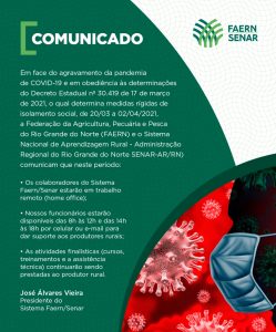 Em face do agravamento da pandemia de COVID-19 e em obediência às determinações do Decreto Estadual nº 30.419 de 17 de março de 2021, o qual determina medidas rígidas de isolamento social, de 20/03 a 02/04/2021, a Federação da Agricultura, Pecuária e Pesca do Rio Grande do Norte (FAERN) e o Sistema Nacional de Aprendizagem Rural – Administração Regional do Rio Grande do Norte (SENAR-AR/RN) comunicam que neste período: