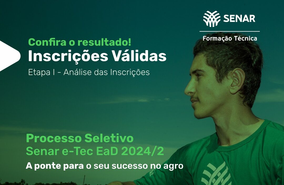 O Serviço Nacional de Aprendizagem Rural (Senar) publicou nesta terça-feira (09) as listas de Inscrições Válidas relativas ao Processo Seletivo da Formação Técnica EaD 2024.2 (confira aqui).