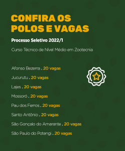 As inscrições para o Processo Seletivo serão realizadas exclusivamente por meio do endereço eletrônico http://www.senar.org.br/etec de 06 de dezembro de 2021 até às 23h59min do dia 24 de janeiro de 2022. A seleção consiste na análise do Certificado de Conclusão do Ensino Médio, do Histórico Escolar ou documento oficial equivalente e dos documentos definidos para a comprovação do público prioritário. O curso tem 1.300 horas (dois anos e meio) com aulas disponibilizadas no portal Rede e-Tec no Rio Grande do Norte e de aulas presenciais no polo de escolha do aluno e em visitas técnicas em propriedades rurais. A organização curricular do Curso Técnico em Zootecnia oferece o desenvolvimento das competências profissionais referentes à produção pecuária e ao processamento de alimentos de origem animal, de modo a contribuir para a competitividade e o desenvolvimento sustentável do setor agropecuário brasileiro.