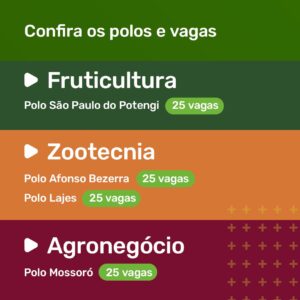 Estão abertas as inscrições para 100 vagas nos Cursos Técnicos de Nível Médio em Zootecnia, Agronegócio e Fruticultura oferecido gratuitamente pelo Serviço Nacional de Aprendizagem Rural – SENAR, na forma subsequente e na modalidade a distância (60% online e 40% presencial). O curso Técnico em Zootecnia será ofertado nos polos Afonso Bezerra e Lajes. Já para os interessados no curso técnico em Fruticultura, as vagas são para o polo São Paulo do Potengi. No polo Mossoró será ofertado o curso técnico em Agronegócio. Os cursos são reconhecidos pelo Ministério da Educação, com diploma válido nacionalmente. Antes de fazer a inscrição, os candidatos devem ler o edital atentamente. Embora o curso seja a distância, o candidato deve indicar um dos polos de ensino para participar das atividades práticas.