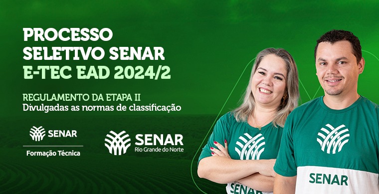 O Serviço Nacional de Aprendizagem Rural do RN (Senar-RN) disponibilizou o Regulamento da Etapa II, que trata da Classificação dos candidatos do Edital Nº 002/2024 dos Cursos Técnicos de Nível Médio (clique aqui e veja o regulamento).