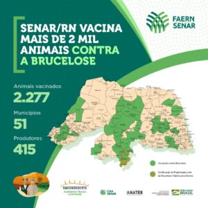 O SENAR/RN divulgou o balanço da campanha de vacinação contra a Brucelose, em 2021, foram 2.277 animais imunizados, em 51 municípios. Os animais são dos produtores rurais atendidos pelo programa de Assistência Técnica e Gerencial – AgroNordeste. Ao todo, 415 produtores foram beneficiados com a ação gratuita oferecida pelo SENAR/RN. A vacinação das bezerras de 03 a 08 meses foi realizada pelo médico veterinário credenciado no IDIARN, Dr. Caio Galtieri.